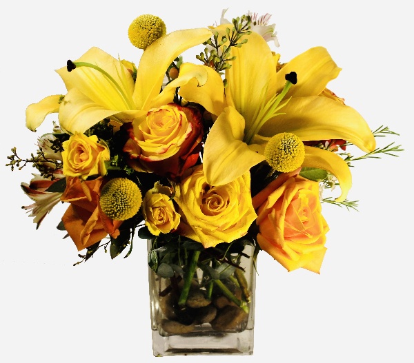 Sunrise: Yellow Lilies, Yellow Red Roses, White Alstroemerias, Yellow Spray Roses and White Wax flowers arranged in a square glass vase