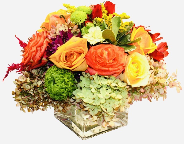 Blooming Marvellous: Yellow Roses, Orange Roses, Green Poms Buttons, Green Poms Cushions, Purple Poms, Red Alstroemerias and Fall Hydrangeas arranged in a square glass vase