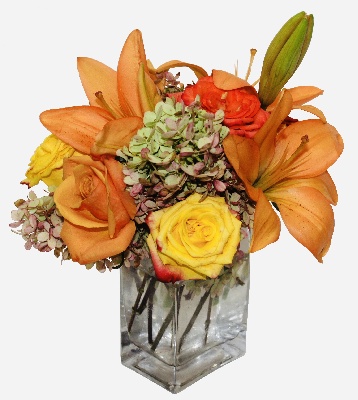 Sweet Splendid: Orange Lilies, Orange Roses, Yellow Roses and Fall Hydrangeas