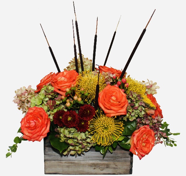Vibrant Autumn: Bi-color Redish Orange Roses, Yellow Protea, Red Poms, Orange Hipericums and Fall Hydrangeas arranged in a wooden box with accents of cattails